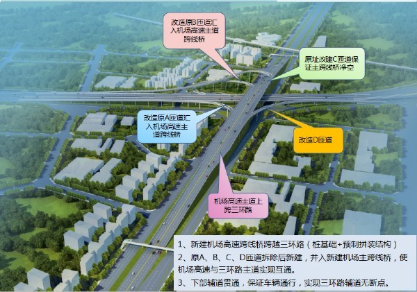 三環(huán)路擴(kuò)能提升工程(藍(lán)天立交節(jié)點改造工程)“融資+施工總承包”,主線橋為預(yù)制拼裝橋梁墩柱、蓋梁、箱梁全部采用預(yù)制結(jié)構(gòu),全長1265.68米,橋面長度968.2米,主要為樁基125根、墩柱利舊38根,梁體主要為鋼混疊合梁共計4607噸及預(yù)制小箱梁共計333片。